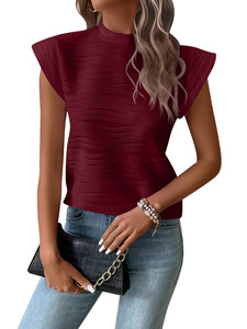 ヨーロッパとアメリカのクロスボーダー 2024 Amazon 独立したステーション夏の新製品ハーフタートルネックテクスチャ波状ストリップボタン半袖トップ