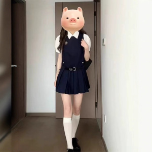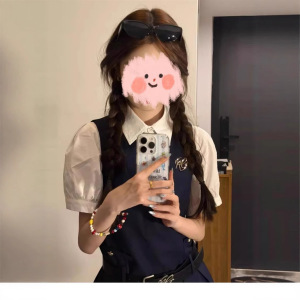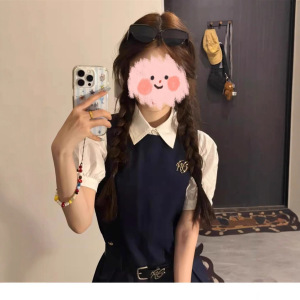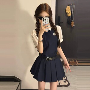 小个子设计感收腰衬衫短袖上衣女学院风无袖背心百褶连衣裙两件套