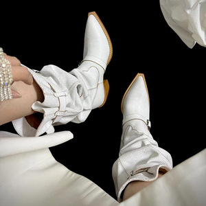 牛革バージョン〜ヨーロッパとアメリカのホットガールスタイルのポインテッドトゥホワイトパイルブーツウエスタンカウボーイブーツレディースワイドチューブナイトブーツロングブーツ