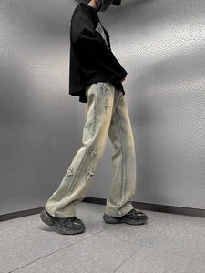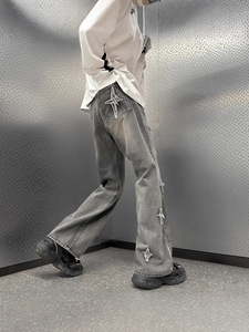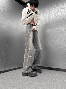 刺绣微喇牛仔裤男直筒宽松阔腿美式高街裤子潮牌痞帅水洗复古长裤