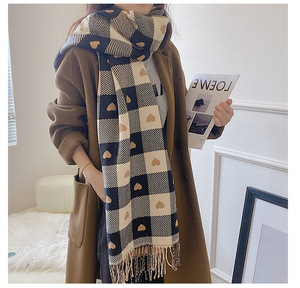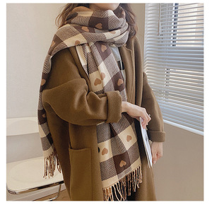 秋冬季仿羊绒女双面爱心格子围巾韩国流苏保暖大披肩百搭加厚围脖