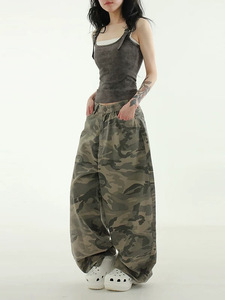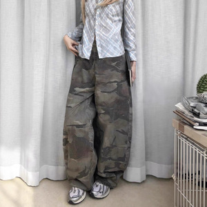 梵思羽2025夏新款美式复古迷彩工装牛仔裤女高腰宽松阔腿拖地裤子