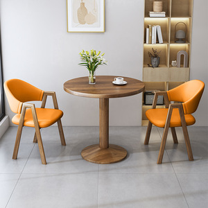 オレンジ60ウォールナット丸テーブル+革張りチェア2脚