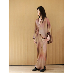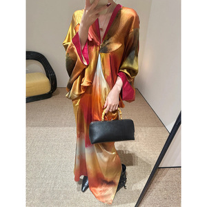 复古轻奢缎面蝙蝠袖罩衫裙法式开叉晕染印花立裁垂褶V领连衣裙长