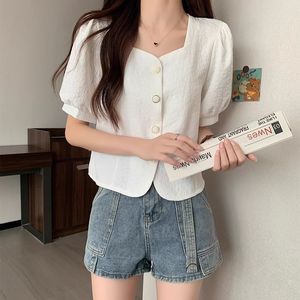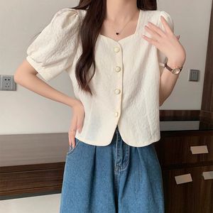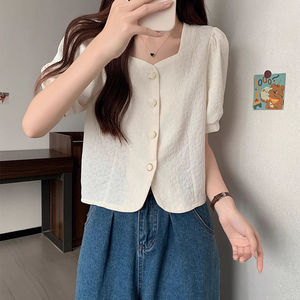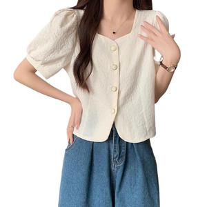 方领泡泡短袖小香风别致2025夏季新款宽松百搭衬衫女T恤短款上衣
