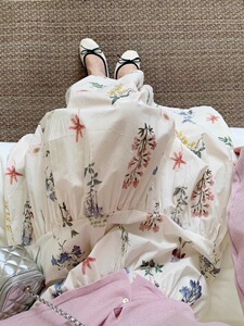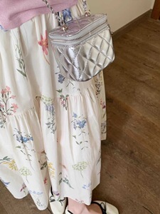 フレンチスイートフローラルAラインウエストゴム白プリーツスカートレディース夏新作小柄ミドル丈スカート