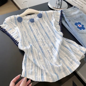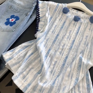 初夏の女性向けの青い小さなフライングスリーブコットンとリネントップス、美しいシングルウェア、フレンチスタイルのユニークで美しいベビードール半袖シャツ
