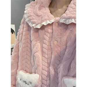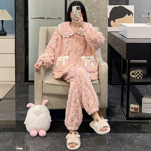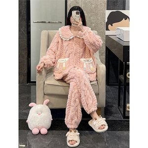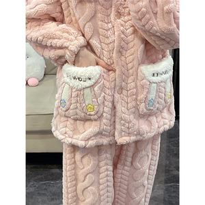 秋冬季珊瑚绒睡衣女款大码加厚保暖法兰绒可外穿春粉红家居服套装