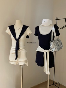 【WGWE】6236 韓国風ショール半袖トップスとショーツのスリーピーススーツセット 2025夏