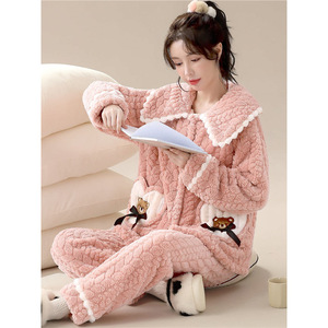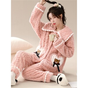 秋冬季新款法兰绒睡衣女士可爱外穿加厚大码珊瑚绒保暖家居服套装