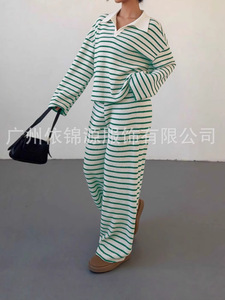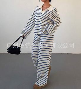 2025年秋冬ヨーロッパとアメリカのクロスボーダーストライプラペルファッショナブルなニットルーズ長袖トップカジュアルパンツスーツ