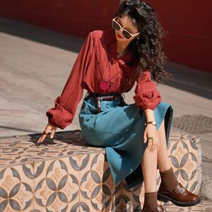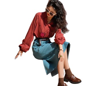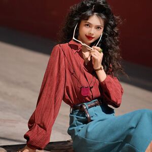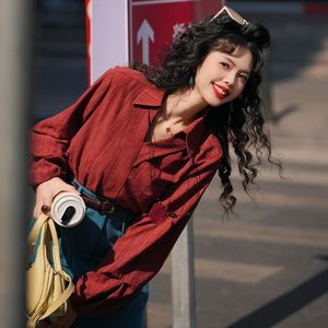 港风复古v领斜襟长袖红色衬衣春秋新款气质宽松休闲上衣通勤小衫