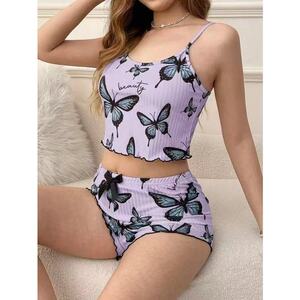 25希音热卖睡衣2件套女跨境爆款新品蝴蝶印花欧美家居服印花坑条