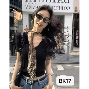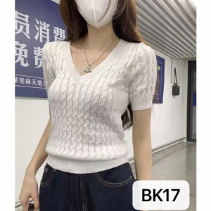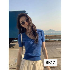 年轻甜辣妹贵气质针织衫短袖T恤女条纹V领休闲透气舒适时尚冰爽丝