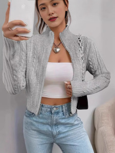 2025跨境爆款女装春秋款立领气质通勤轻熟风拉链长袖针织开衫外套