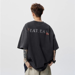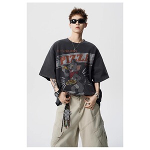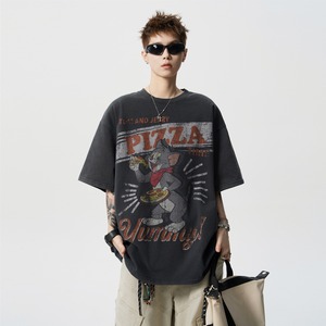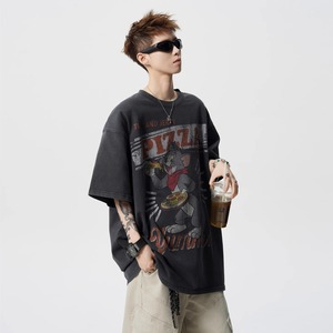 アメリカンスタイルのダメージ加工カップル半袖メンズ夏のトレンディなブランドウォッシュ漫画プリントラウンドネックTシャツヘビーレトロカジュアルトップ