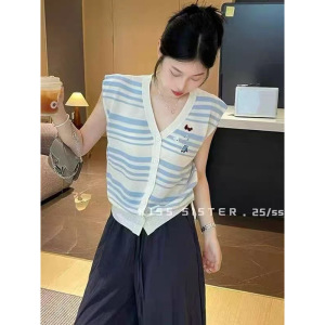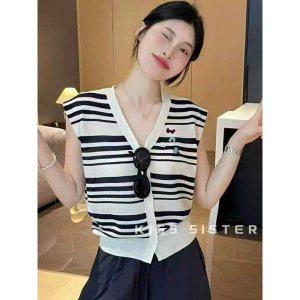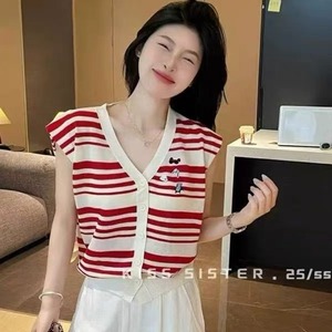 轻奢小香撞色条纹拼色V领无袖针织衫女夏季舒适透气修身显白上衣