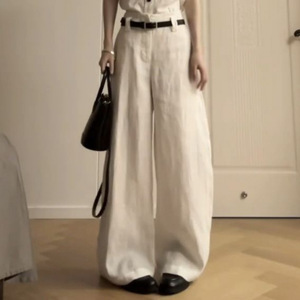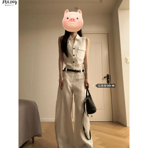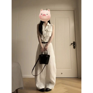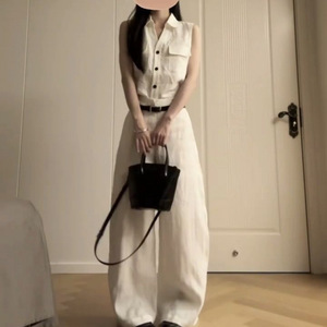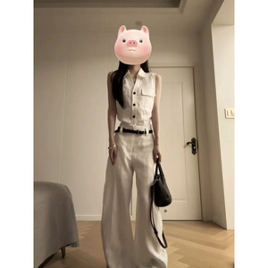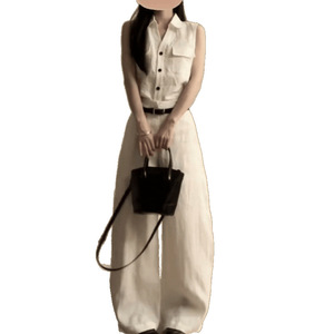 フレンチホワイトVネックノースリーブベストシャツレディース2025年夏新作ハイエンド気質ワイドレッグパンツ2点セット