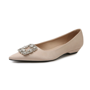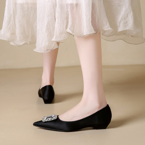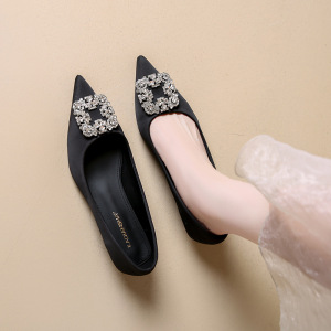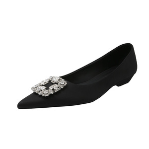 サテンフレンチポインテッドトゥシューズ女性のための 2025 夏の新しいスクエアバックルラインストーンスカート気質プロフェッショナルフラットシューズ