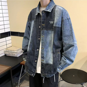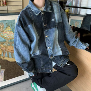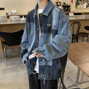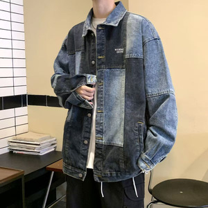 デザインコントラストカラーステッチウォッシュデニムジャケット春秋レトロトレンディアメリカンルーズカジュアルラペルジャケット