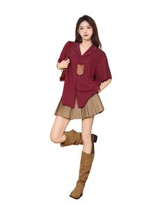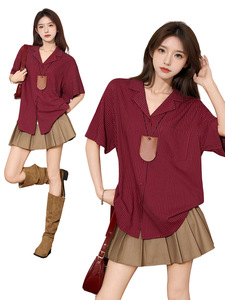 美式复古正肩红色翻领短袖条纹衬衫女夏季宽松显瘦设计感衬衣上衣