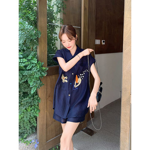 ネイビーブルー年齢軽減刺繍軽量半袖シャツスーツ女性用2025年夏新作小柄ショーツ2点セット