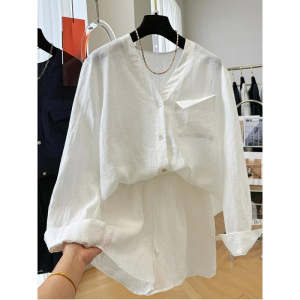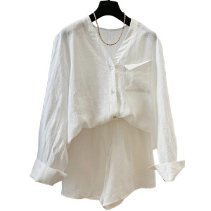 2025年夏人気のツーピースルーズVネック日焼け止めシャツとショーツのセット、女性用の見栄えの良いラミースーツの完全なセット