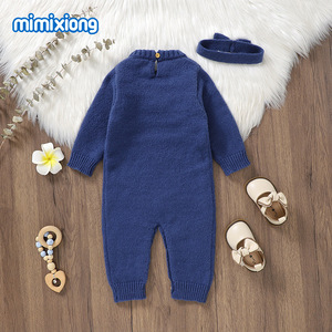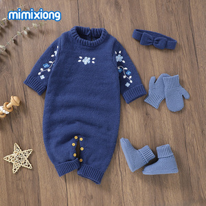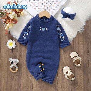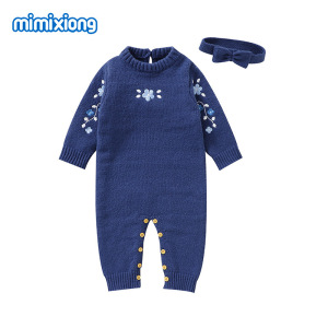 ins热卖新款宝宝针织纯色绣花连体哈衣爬服+发带套装