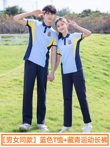 【男女同スタイル】ブルーTシャツ+紺スポーツパンツ