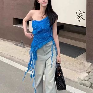 不規則なブルー水玉斜め肩キャミソール女性の夏のフリルスリムノースリーブアウターデザイントップ