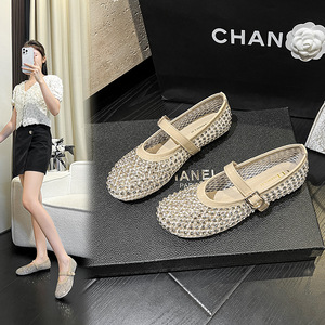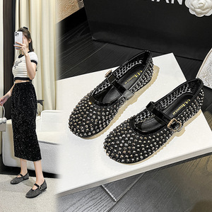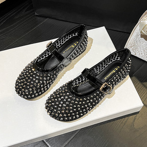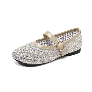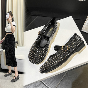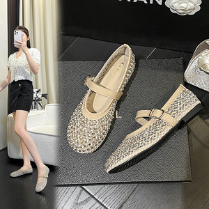 女性用既製フラットメリージェーンシューズ、通気性メッシュバレエサンダル、ワンラインバックル浅口シューズ、ラインストーン、Lサイズ43