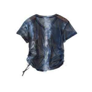 ストリートスタイルのバイカーガールコントラストカラータイダイメッシュトップ夏クール半袖巾着ウエスト痩身Tシャツ