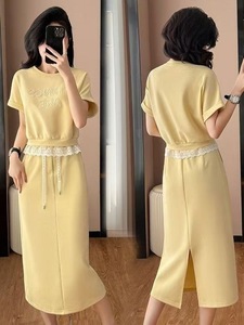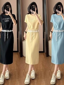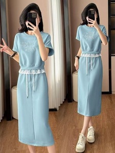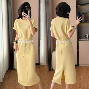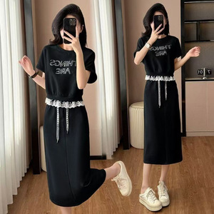 カジュアルスポーツスカートスーツ女性のための 2025 夏の新しいルーズレーススプライシングスウェットシャツスカートツーピースセットブラック