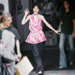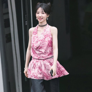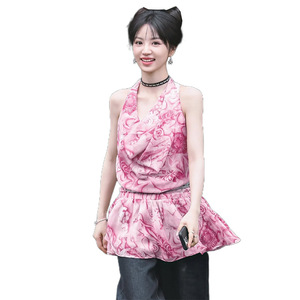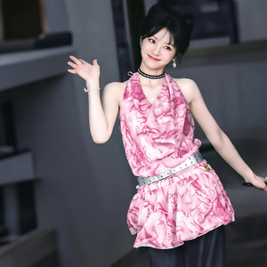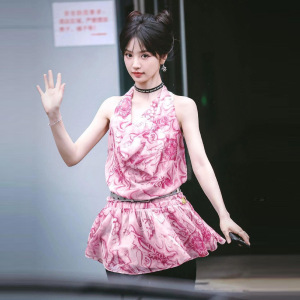 ファッション 2025 夏の新女性の Tian Xiwei 同じスタイルのリゾートスタイルプリントホルターネックスイングカラーサスペンダードレス女性