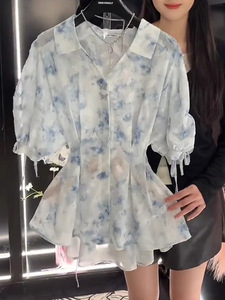 POLO领碎花短袖衬衫女2025年夏季新款压褶收腰遮肚子显瘦气质上衣