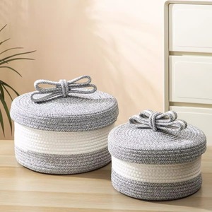 跨境热销棉绳编织杂物收纳篮 圆形拼色置物篮有盖家居布艺杂物篮