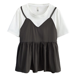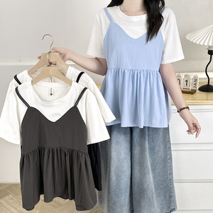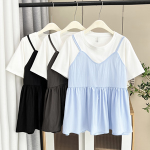 2025 大きいサイズの女性の夏の新しいスタイルの肉をカバーする偽ツーピース半袖 100kg ファット MM 年齢を減らす半袖トップ 7725