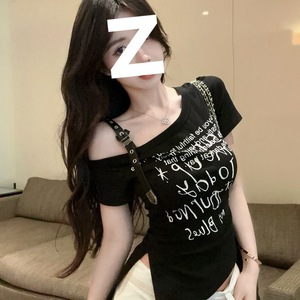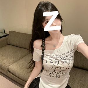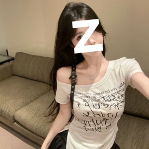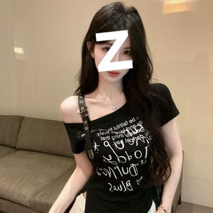 夏の女性用の不規則な斜め肩半袖Tシャツ、アメリカのホットガールのワンショルダートップ、ニッチでユニークで美しいデザイン