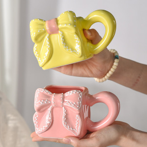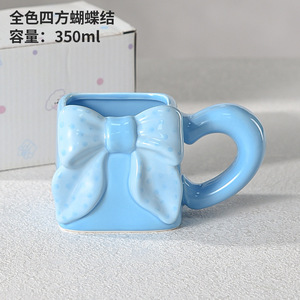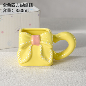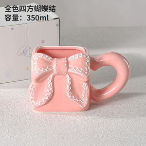 フルカラースクエアリボンスクエアカップ大きなハンドルセラミックマグ高価値ガーリーハートドリンクカップホームカップ