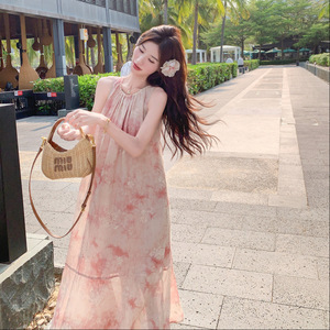 女性のためのピンクのホルターネックドレスの実物写真 2025 夏の新しいフレンチスイートホリデースタイルの優しいノースリーブベストドレス