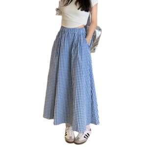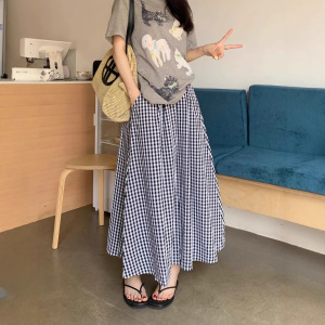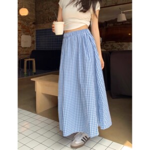 ブルーチェック柄スカートレディースミドル丈2025夏新作韓国風ハイウエストスリムAラインウエストゴム傘スカート