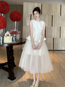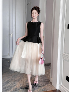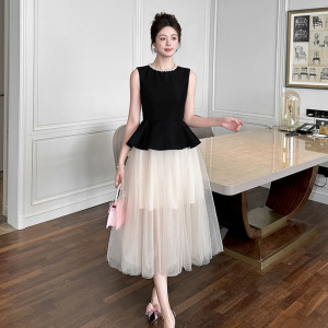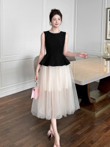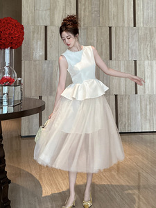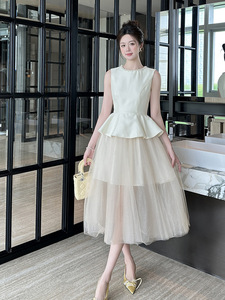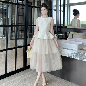 2025 新しい夏の女性のフレンチラウンドネックウエストカバー腹ステッチメッシュフェイクツーピースドレス 9012