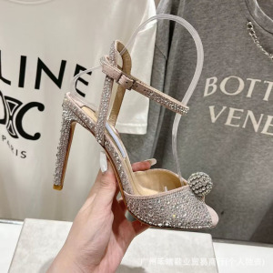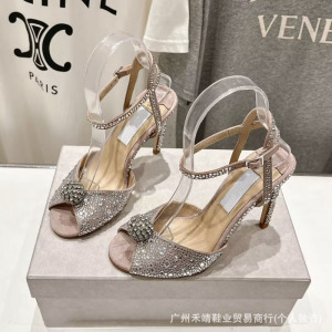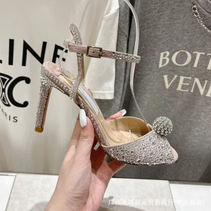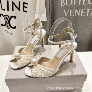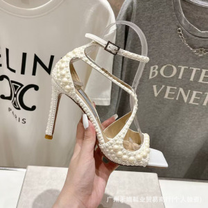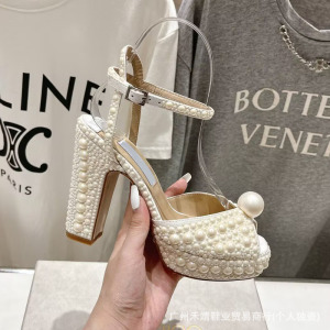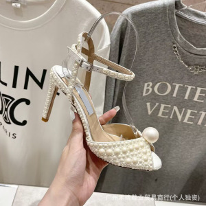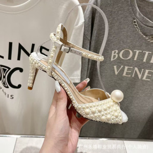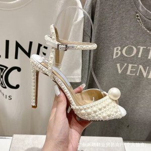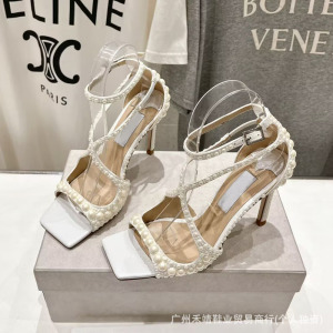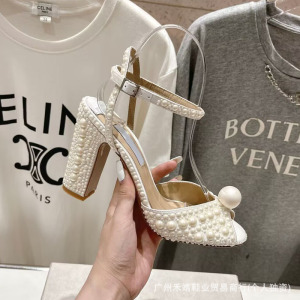 2025夏季珍珠鞋粗跟高跟鞋新款一字扣带女鞋婚鞋真皮鱼嘴时装凉鞋