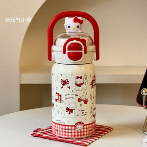 红提手透明白红星球保温杯500ML】-红格子白猫图+红猫公仔