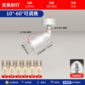 【吸顶款】5w 白光6000K「可调焦10°-60°」