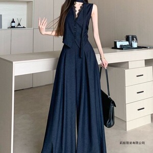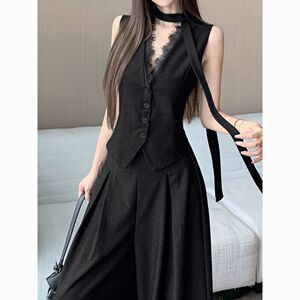 2025 初夏搭配一整套时尚V领蕾丝马甲上衣套装女阔腿裤气质两件套