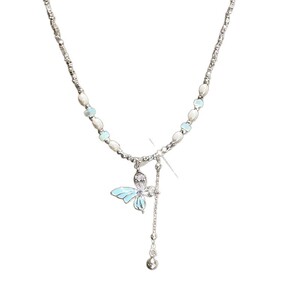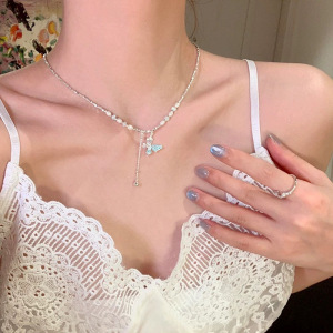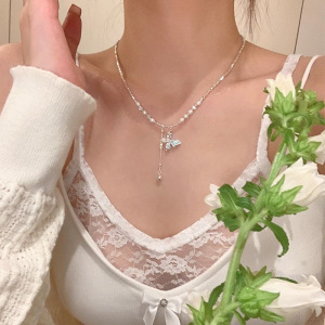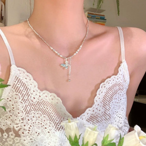 碎银子珍珠蓝色锆石蝴蝶项链法式小众高级感锁骨链颈链配饰