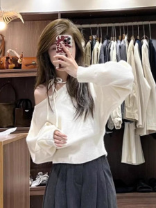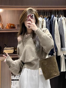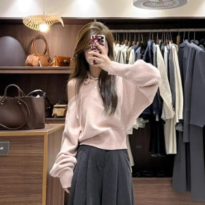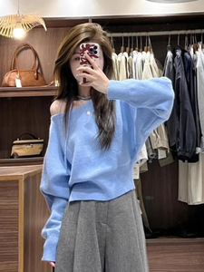 纯欲慵懒风软糯不规则斜领露肩宽松休闲百搭系带长袖套头毛衣女秋