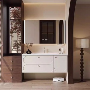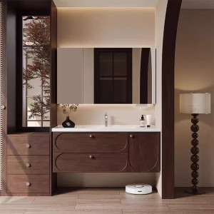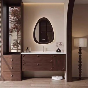 中古风陶瓷一体盆橡木浴室柜卫生间胡桃木色骨骼线洗漱台洗脸盆柜