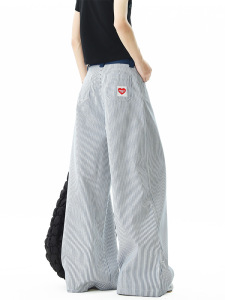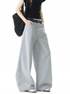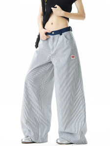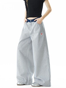 美式复古条纹直筒牛仔裤女夏季韩版潮流拼色宽松百搭休闲长裤